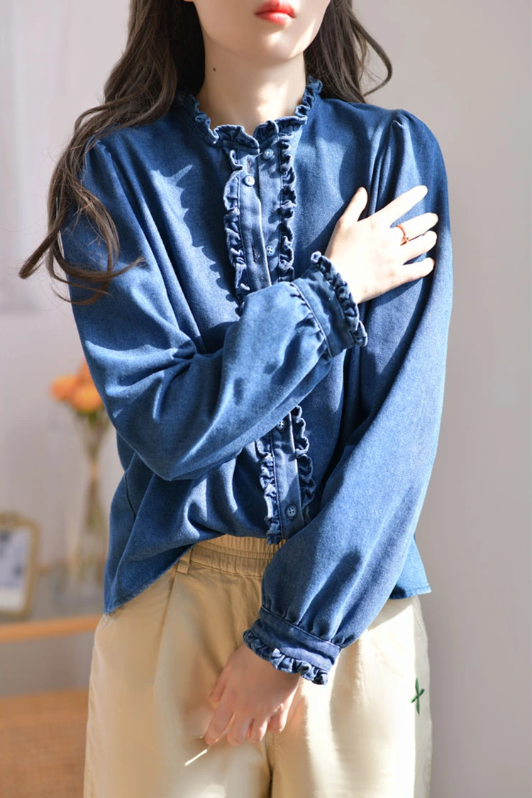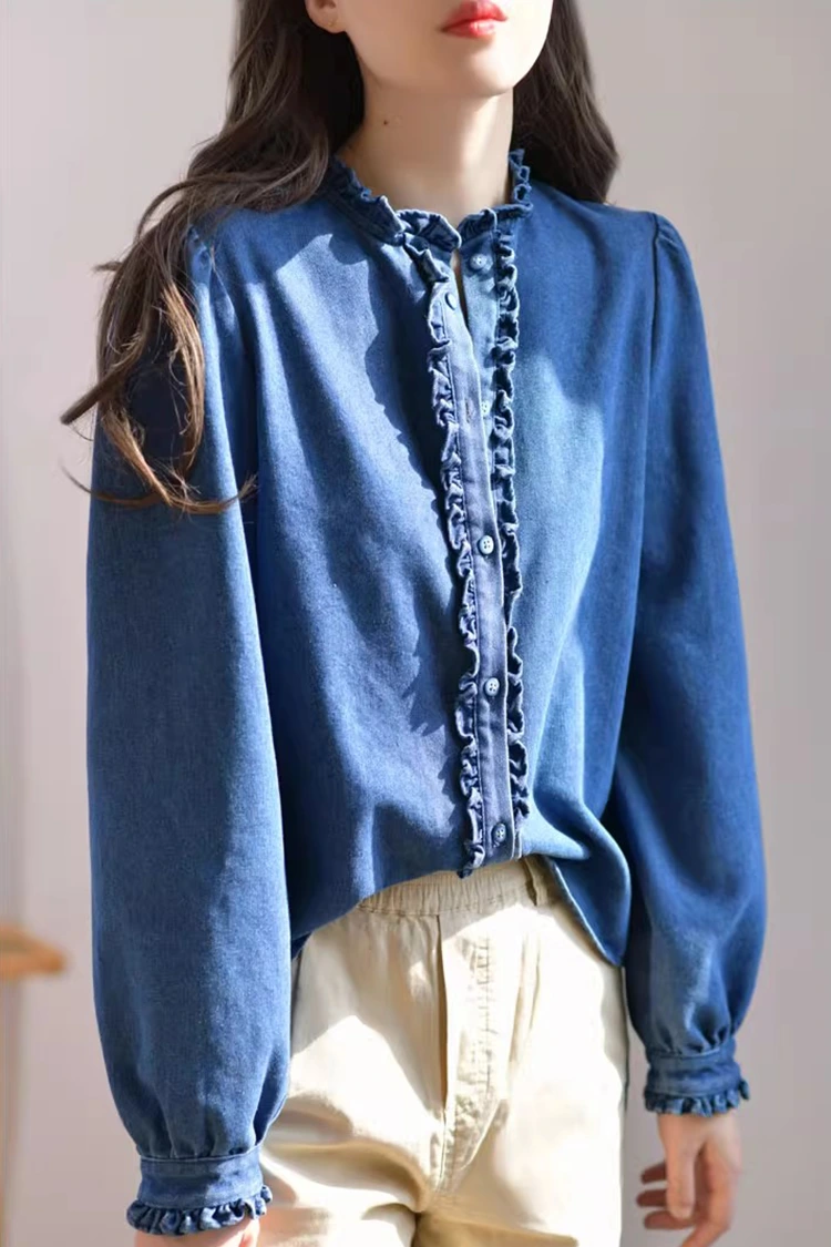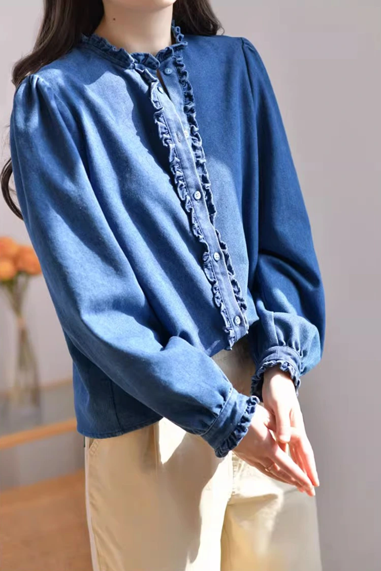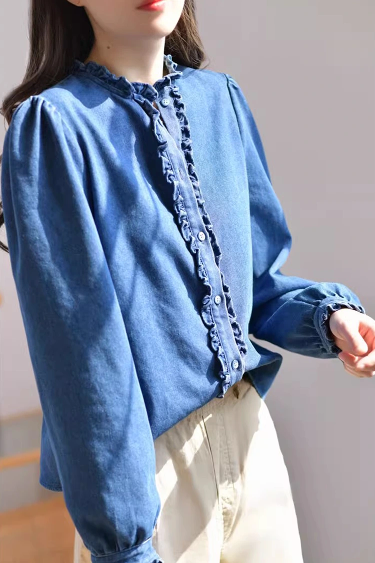 レディースデニムカジュアルブラウスはレトロでカジュアルなパターンデザインを採用しており、女性の体の形に正確にフィットします。体型に依存せず、肩や首のラインをすっきりさせるだけでなく、ウエストや腹部の余分な脂肪も隠すことができます。さまざまな体型のニーズに応えます。衿はスタンドカラーにデザインし、絶妙なフリルを組み合わせています。前開きと袖口にも繊細なフリルが施されています。ふんわりとしたランタン型の長袖と合わせて、レトロなエレガンスとカジュアルな気軽さを完璧に組み合わせています。シンプルな無地のパターンはクラシックで耐久性があり、時代遅れになりません。デイリーカジュアルからシンプルなビジネススタイルまで演出でき、実用性も抜群です。