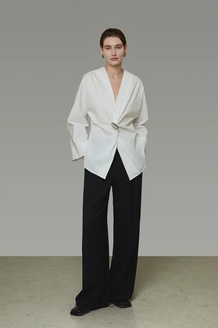 レディース春の新作 – メタルバックル付きクロスフロントシャツ、非対称ノットデザイン、リラックス&カジュアルフィット